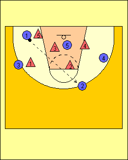 這個陣法在國內的賽事中可能少見,不過80、90年代有不少NCAA名校都使用過此法,如Arizona、Temple等,但其中的翹楚非90年初的流寇(UNLV)莫屬。它的用意在迫使進攻方搞不清楚是盯人或區域,而它的輪轉方式(rotation)也非常特別,就用下面的幾個圖簡單說明。(基本上,他是屬於機動性較高的聯防)