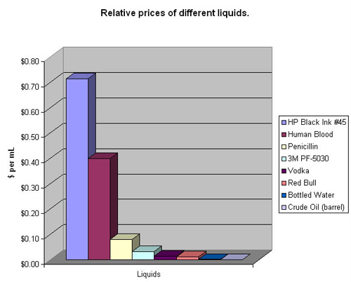 從這個表圖可以發現,HP 的墨水竟然遠貴於紅十字會 500ml 賣 US$200 的人血!